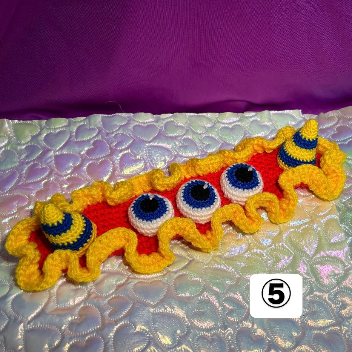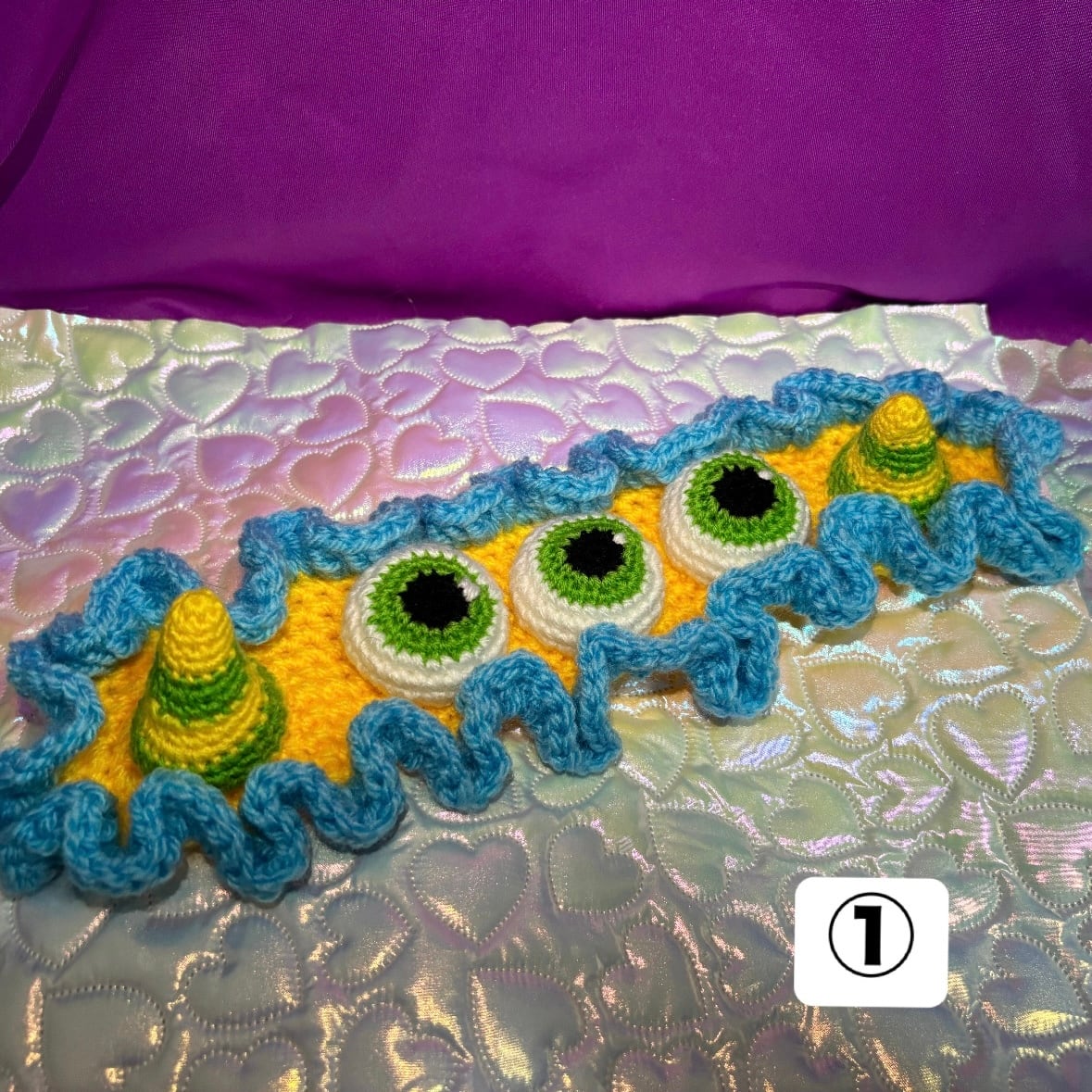 毛糸で編んだカラフルでポップなもんすたーのヘッドドレスです(՞. ̫ .՞)